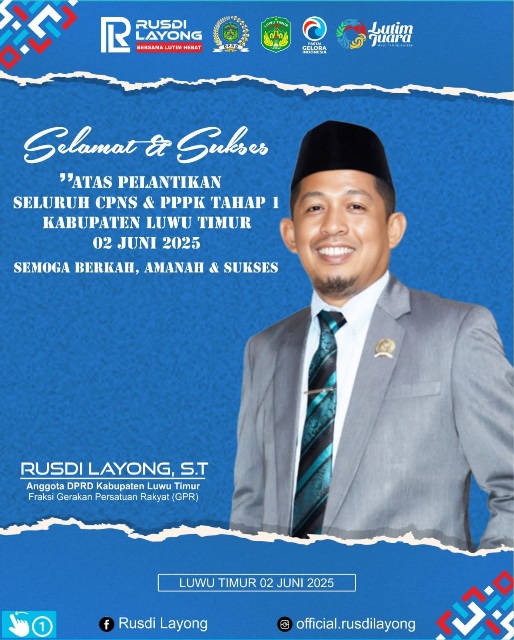 LUWU TIMUR, SUARATERKININEWS.COM – Rusdi Layong, S.T, Anggota DPRD Kabupaten Luwu Timur, Yang juga menjabat Ketua Badan Kehormatan mengucapkan selamat dan sukses atas pelantikan seluruh CPNS dan PPPK tahap I Kabupaten luwu timur, “Semoga berkah, Amanah dan Sukses”. Senin 2 Juni 2025.