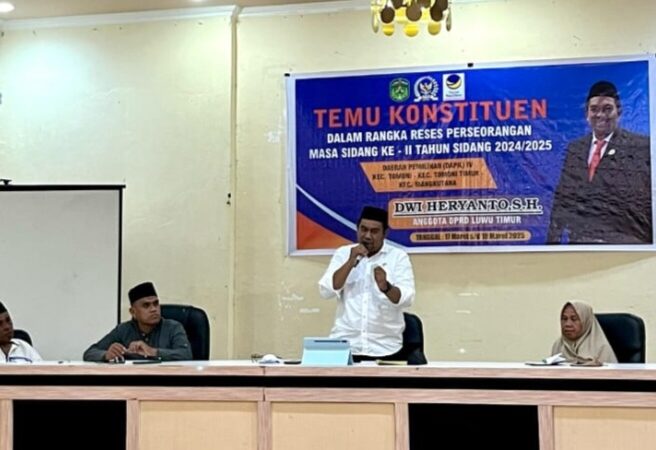 LUWU TIMUR, SUARATERKININEWS.COM- Anggota DPRD Luwu Timur Dwi Haryanto,.SH, gelar temu Konstituen dalam rangka reses perseorangan masa sidang ke II tahun sidang 2024/2025 di 3 Kecamatan Tomoni, Tomoni Timur dan Mangkutana, yang bertempat di hotel sikumbang. Selasa (18/03/2025).