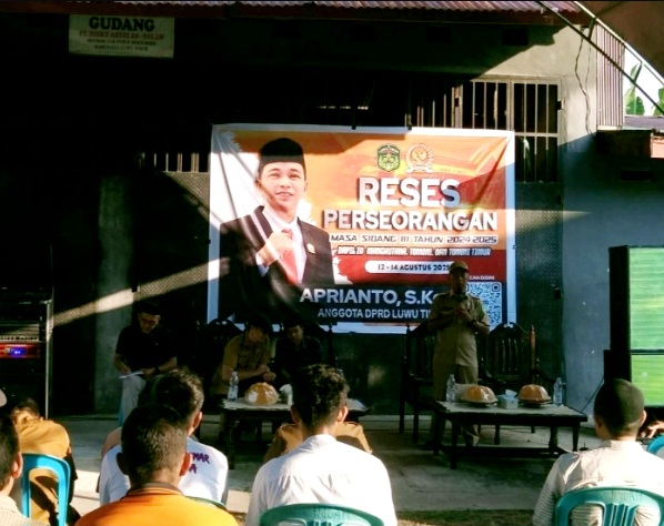LUWU TIMUR, SUARATERKININEWS.COM- Anggota DPRD Luwu Timur, Aprianto, pada saat di konfirmasi media suaraterkininews.com, mengatakan pada saat reses perseorangan masa sidang ke III tahun sidang 2024/2025, ini merupakan amanah dari Undang-Undang, sekaligus kesempatan bagi saya selaku wakil rakyat untuk turun langsung ke daerah pemilihan, menyerap aspirasi, mendengar langsung kebutuhan dan harapan masyarakat. Selasa 12 Agustus 2025.