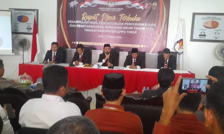 LUTIM, SUARATERKININEWS.COM- Komisi Pemilihan Umum (KPU) Luwu Timur rekapitulasi suara Pemilu 2024 di Kantor KPU Luwu Timur, jalan Soekarno Hatta, Desa Puncak Indah, Kecamatan Malili, Sulawesi Selatan. Kamis 29/2/2024.
