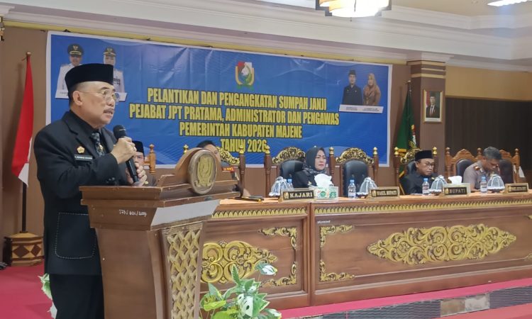 MAJENE, SUARATERKININEWS.COM, – Pemerintah Kabupaten Majene menggelar prosesi pelantikan dan pengambilan sumpah jabatan bagi pejabat Pimpinan Tinggi (JPT) Pratama, Administrator, dan Pengawas di Ruang Pola Kantor Bupati Majene, Senin (13/04/2026). Langkah ini diambil sebagai bagian dari penyegaran birokrasi dan penguatan kualitas pelayanan publik di Bumi Assamalewuang.