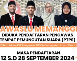 LUWU TIMUR, SUARATERKININEWS.COM- Bawaslu Luwu Timur (Lutim) bersiap merekrut 457 Pengawas Tempat Pemungutan Suara (PTPS) dalam rangka Pemilihan Kepala Daerah (Pilkada) serentak 2024. Ketua Bawaslu