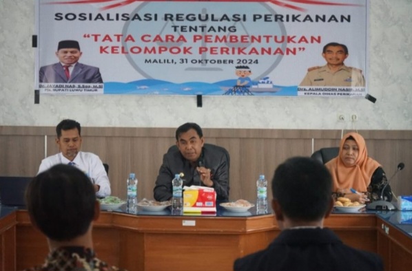 LUWU TIMUR, SUARATERKININEWS.COM- Dinas Perikanan (Diskan) Kabupaten Luwu Timur menggelar kegiatan sosialisasi regulasi perikanan tentang tata cara pembentukan kelompok perikanan yang dilaksanakan di Aula Kantor Diskan, Malili, Kamis (31/10/2024).