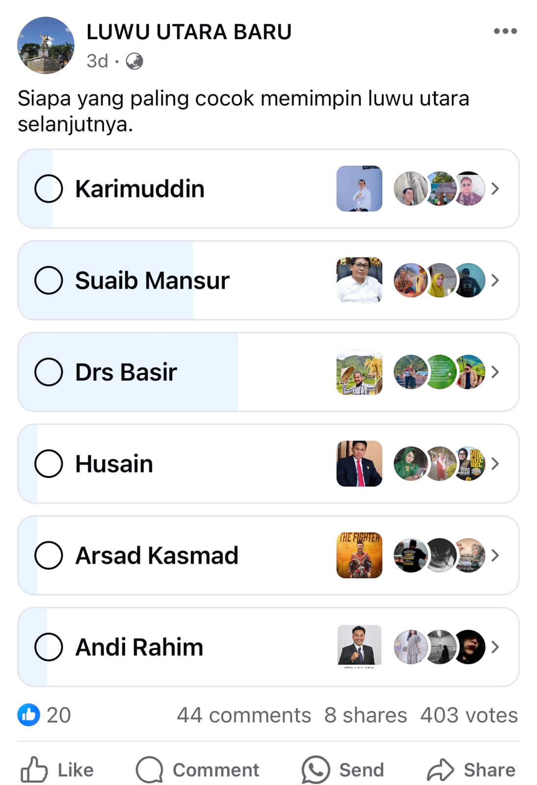 Pada kamis (18/04/24) kemarin akun Luwu Utata Baru membuat polling pada Grup Facebook Kabar Luwu Utara yang diikuti oleh 404 peserta. Mencantumkan 6 nama calon yaitu Karimuddin, Suaib Mansur, Drs. Basir, Husain, Arsyad Kasmar dan Andi Rahim.