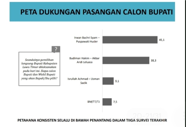MAKASSAR, SUARATERKININEWS.COM- Lingkaran Survei Indonesia (LSI) Denny JA merilis hasil survei terbaru untuk Pilkada Luwu Timur 2024. Berdasarkan hasil survei yang dipresentasikan Sabtu (23/11/2024) di Hotel Mercure, Makassar, pasangan nomor urut 3, Irwan Bachri Syam-Puspawati Husler (IBAS-Puspa), diunggulkan sebagai pemenang.