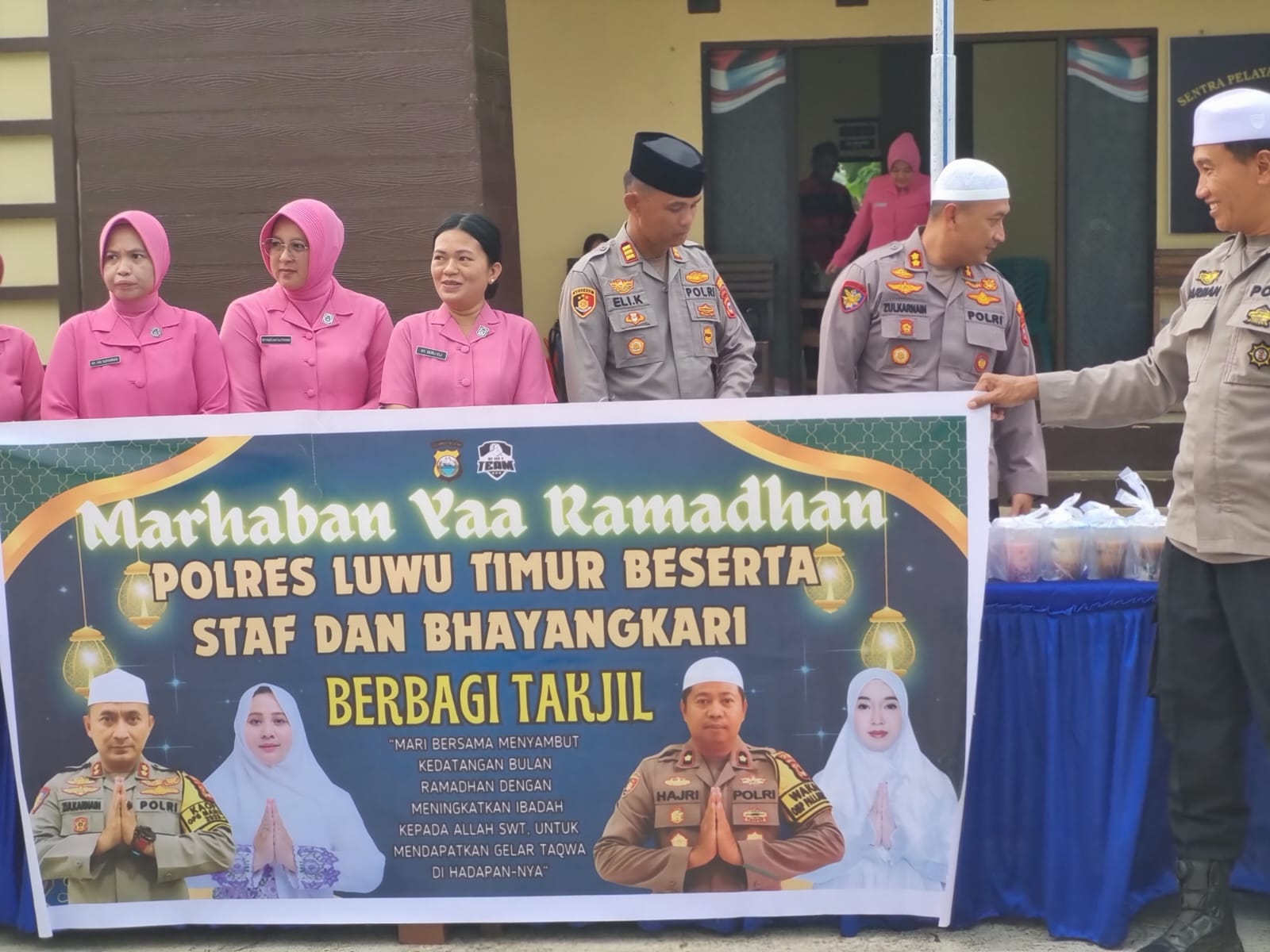 LUWU TIMUR, SUARATERKININEWS.COM- Personel Polres Lutim dan Polsek Malili serta Bayangkari Ranting Malili melaksanakan giat pembagian Takjil dengan sasaran masyarakat ataupun pengendara R2 (Roda dua) dan R4 (Roda empat) yang melintas di depan mako Polsek Malili, 10 Maret 2025