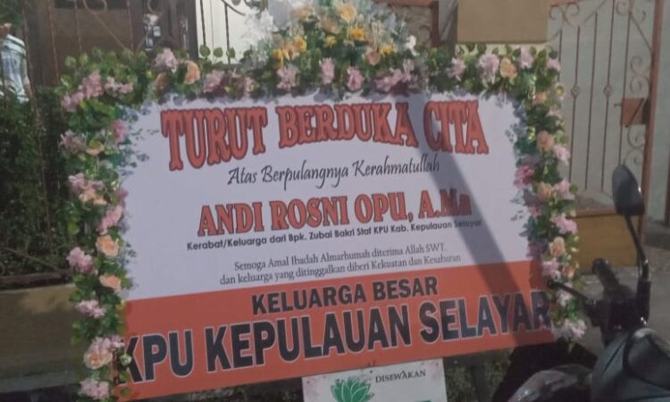 Dari pantauan wartawan di rumah duka, hari Jum’at, (24/5/2024) malam, karangan bunga duka cita yang dikirimkan KPU Kabupaten Selayar, masih tampak terpasang di depan rumah duka di Jln. WR. Supratman No. 8, Kelurahan Benteng, Kecamatan Benteng.