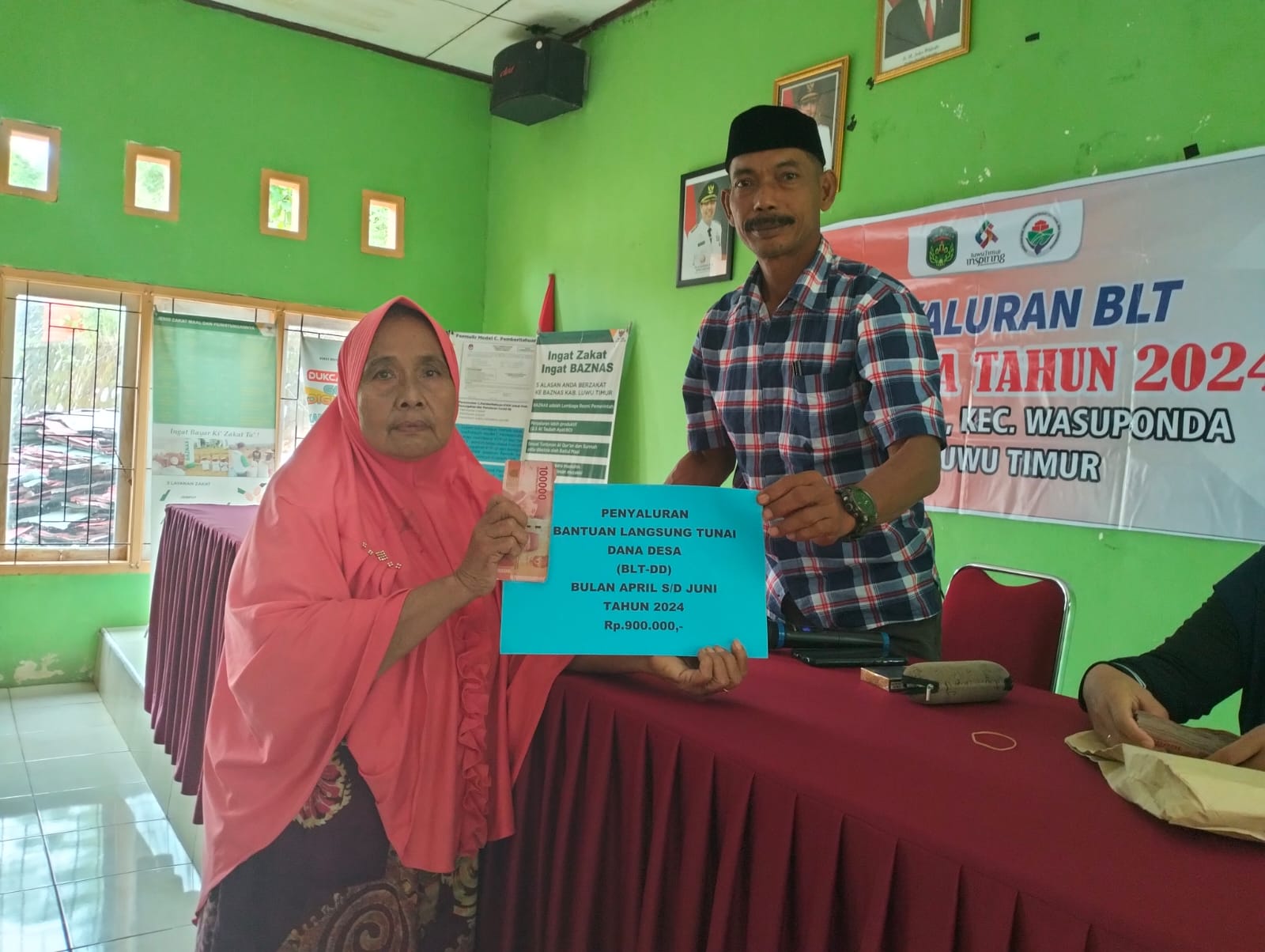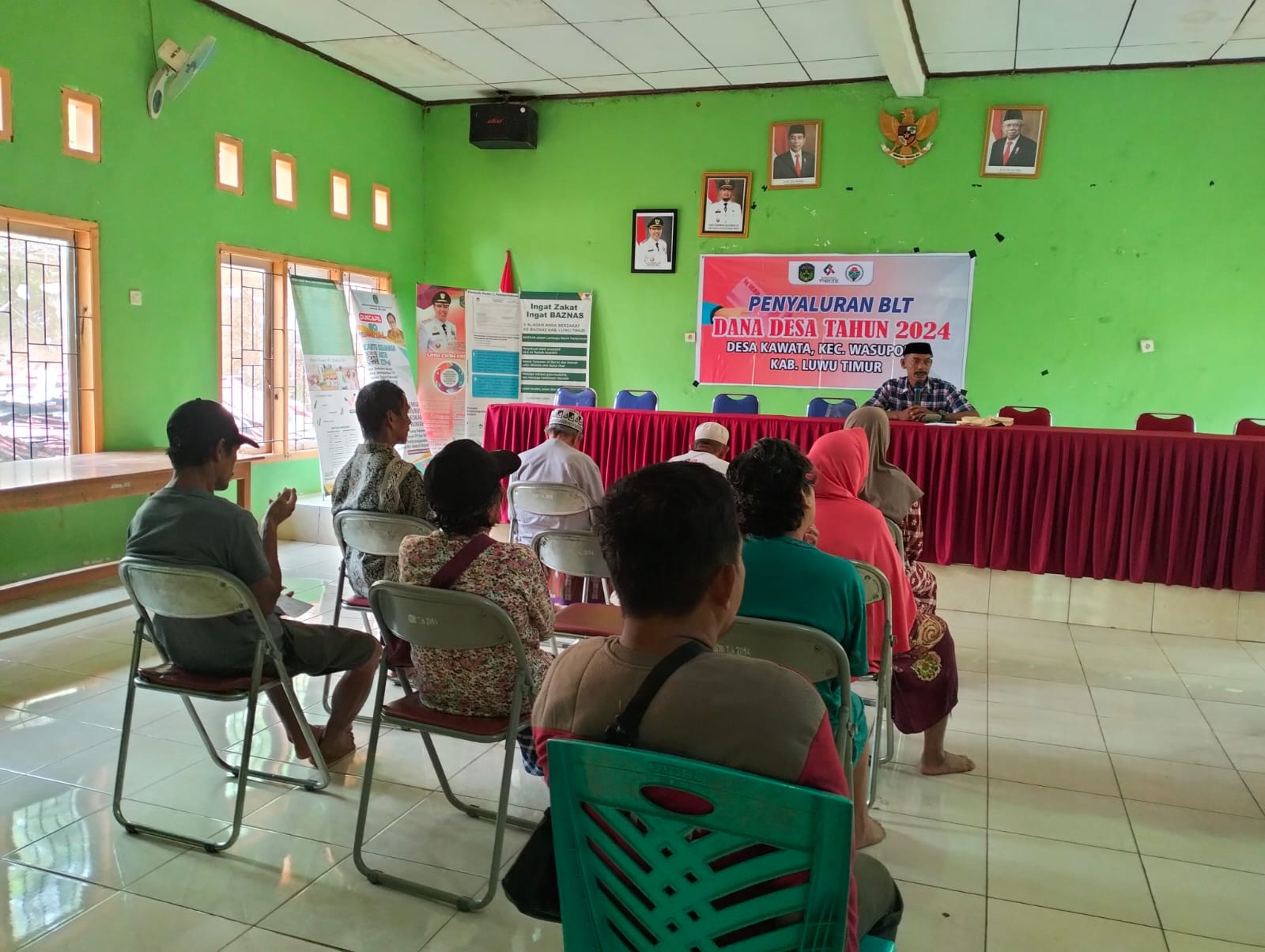 Penerima BLT tahap ke II, berjumlah 14 Kepala Keluarga, dimana setiap kepala keluarga menerima BLT berjumlah Rp. 900.000, Per 3 bula, yang digelar di Aula kantor desa kawata, Jumat (14/06/2024).