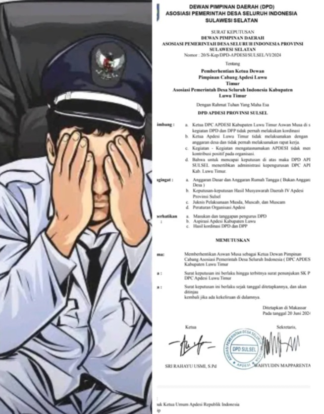 Pemberhentiannya berdasarkan surat keputusan DPD APDESI Sulawesi Selatan dengan nomor : 20/S-Kep/DPD-APDESI/SULSEL/VI/2024.