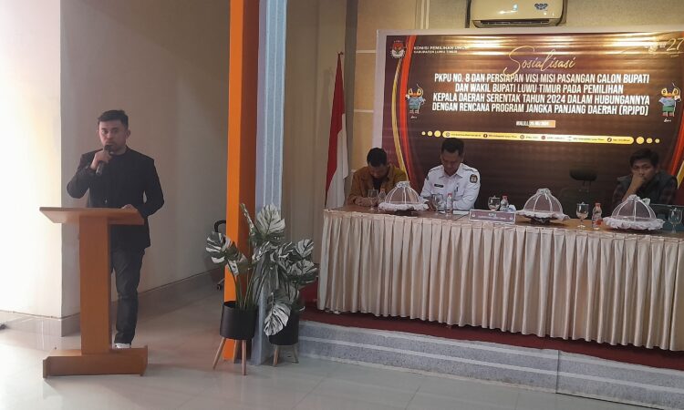 LUWU TIMUR, SUARATERKININEWS.COM- Komisi Pemilihan Umum (KPU) kabupaten Luwu Timur menggelar sosialisasi PKPU No. 8 dan Persiapan Visi Misi pasangan calon Bupati dan Wakil Bupati Luwu Timur pada Pilkada 2024 dalam hubungan dengan Rencana Program Jangka Panjang Daerah (RPJPD), bertempat di hotel I lagaligo malili.
