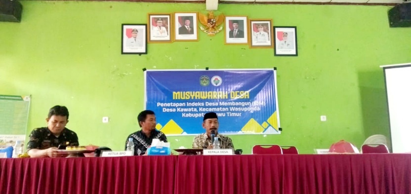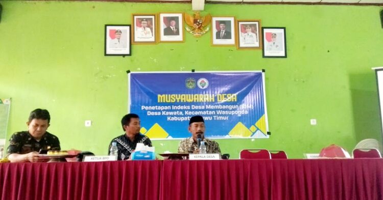 LUWU TIMUR, SUARATERKININEWS.COM- Pemerintah Desa Kawata, Kecamatan Wasuponda, Kabupaten Luwu Timur menggelar Musyawarah Desa Penetapan Indeks Desa Membangun (IDM). Yang berlangsung di Aula kantor Desa Kawata, Kamis 10 Juli 2025.