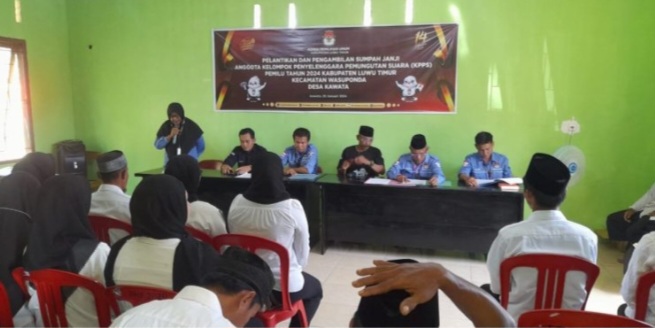 LUTIM, SUARATERKININEWS.COM- Pelantikan Dan Pengambilan Sumpah Janji Anggota, Kelompok Penyelenggaraan Pemungutan Suara (KPPS) Pemilu 2024, Desa Kawata, Luwu Timur di gelar di aula kantor BPD Kawata, Kamis, 25/01/2024.