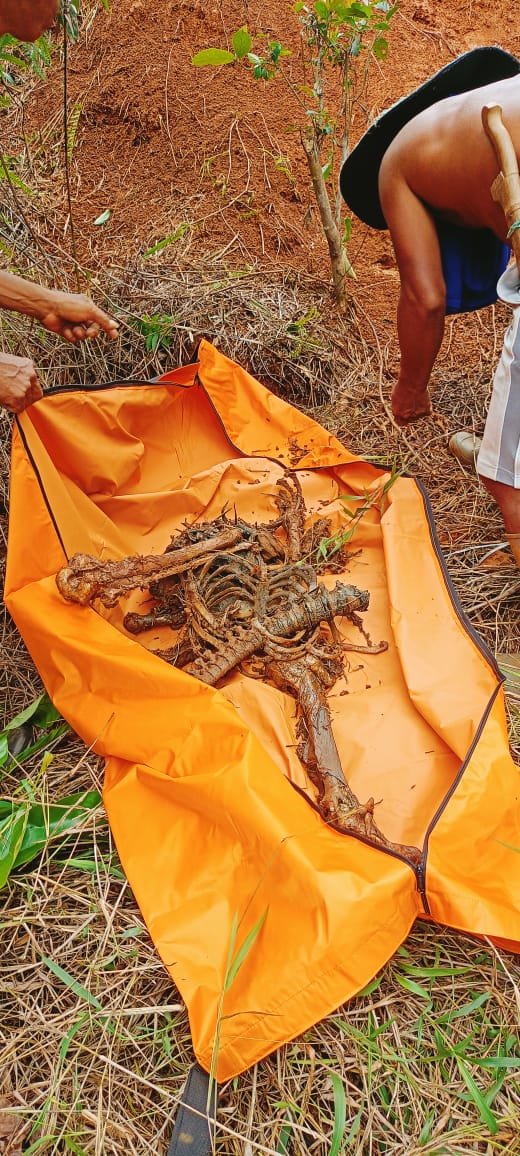 Salah satu keluarga yang ikut ke lokasi penemuan Kerangka langsung ikut mengevakuasi jenazah dan memasukkan kedalam kantung mayat, lalu kemudian dibawa kembali ke desa taripa kecamatan angkon.