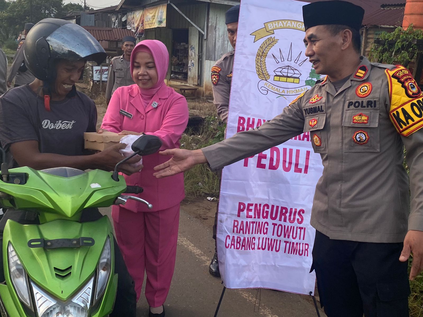 LUTIM, SUARATERKININEWS.COM- Personel Polsek Towuti Polres Luwu Timur bersama pengurus Bhayangkari ranting Towuti bagi-bagi takjil, Minggu (25/3/2024).