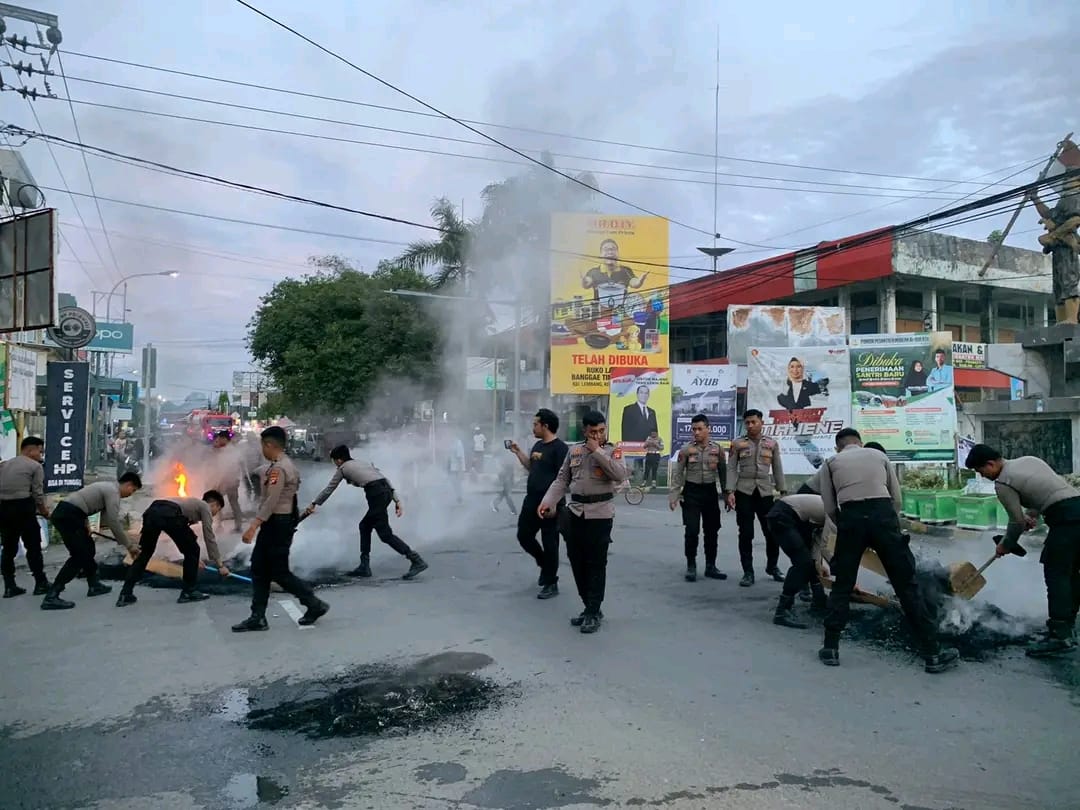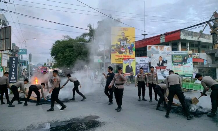 Personil Polres Majene Bersihkan Sisa-sisa Ban Bekas di Lokasi Aksi Solidaritas HMI Cabang Majene