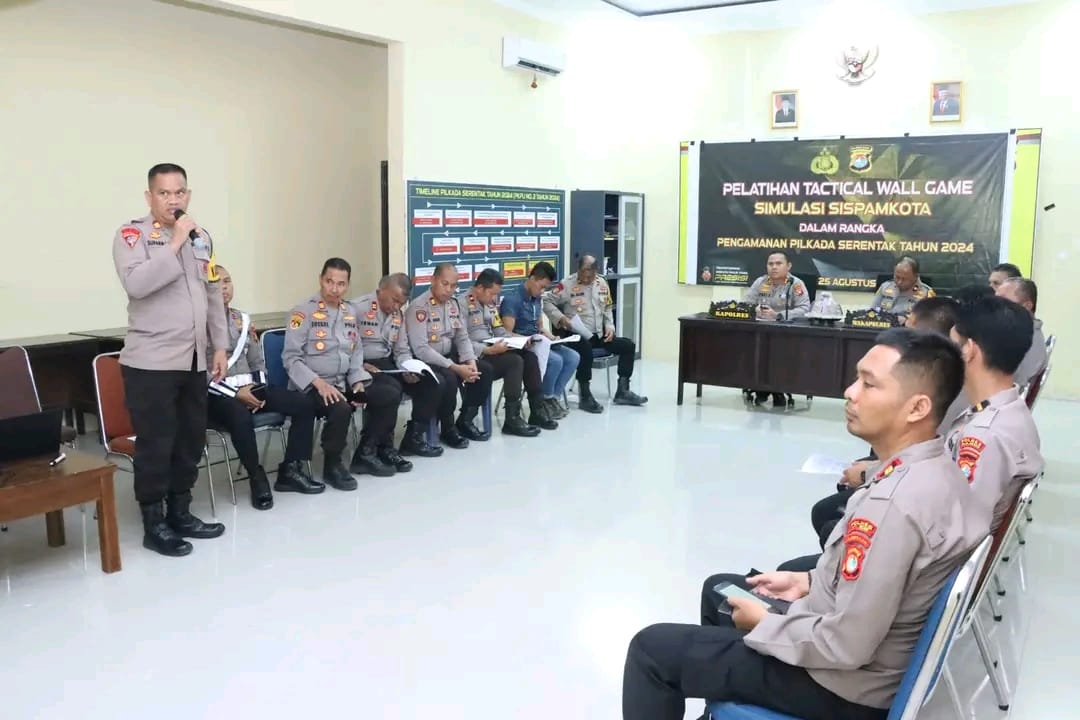 MAJENE, SUARATERKININEWS.COM- Dalam rangka menghadapi Operasi Mantap Praja Marano 2024, Polres Majene menggelar Tactical Wall Game (TWG) Simulasi Sistem Pengamanan Kota (Sispamkota) dalam rangka pengamanan Pilkada Serentak tahun 2024. Kegiatan ini dilaksanakan di ruang Posko Operasi Mantap Praja Polres Majene pada Rabu (21/8/24).