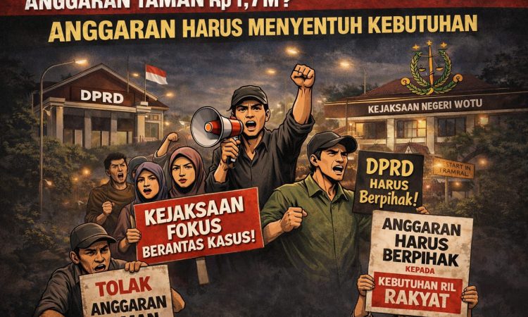 LUWU TIMUR, SUARATERKININEWS.COM, – Beredar isu di tengah masyarakat terkait rencana pembahasan pengalokasian anggaran sebesar Rp1,7 miliar di tingkat DPRD untuk pembangunan taman Kejaksaan Negeri Cabang Wotu memantik kritik keras, salah satunya dari Forum Pemuda dan Mahasiswa Luwu Timur. Kebijakan tersebut disebut-sebut akan didorong atas nama pemerataan pembangunan.