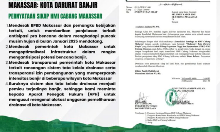 Makassar – Himpunan Mahasiswa Islam (HMI) Majelis Penyelamat Organisasi (MPO) Cabang Makassar merilis pernyataan sikap “Makassar: Kota Darurat Banjir” pada Minggu (28/12/24).