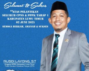 LUWU TIMUR, SUARATERKININEWS.COM – Rusdi Layong, S.T, Anggota DPRD Kabupaten Luwu Timur, Yang juga menjabat Ketua Badan Kehormatan mengucapkan selamat dan sukses atas pelantikan seluruh