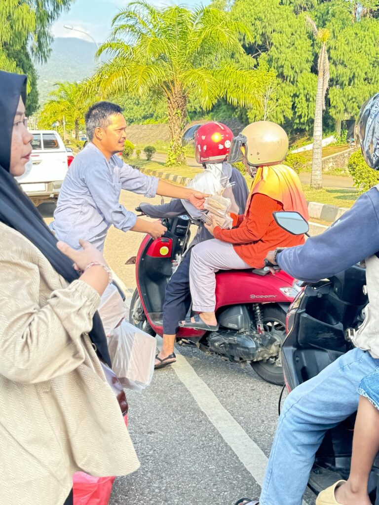 Bertempat di depan Kantor PT Citra Lampia Mandiri di jalan tras malili, sejumlah karyawan sedang membagikan takji ke masyarakat yang sedang melintas.