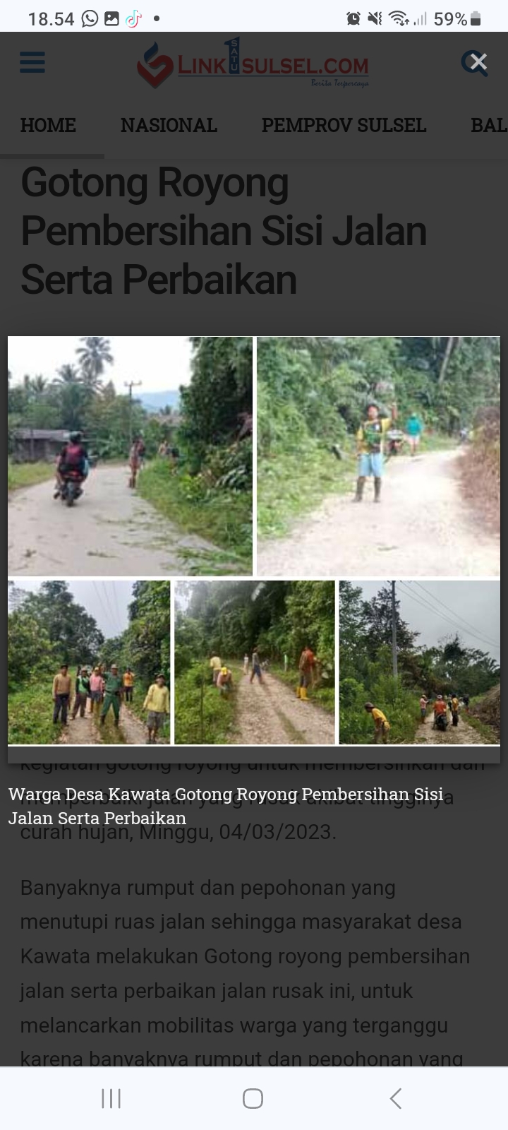 Kepala desa kawata Baharuddin, dan kepala dusun tole-tole Safar ikut serta dalam kegiatan gotong royong bersama sama dengan warga dan menyampaikan bahwa, mari kita tetap bersama sama bergotong royong untuk memperbaiki jalan yang tertutup rumput dan rusak.